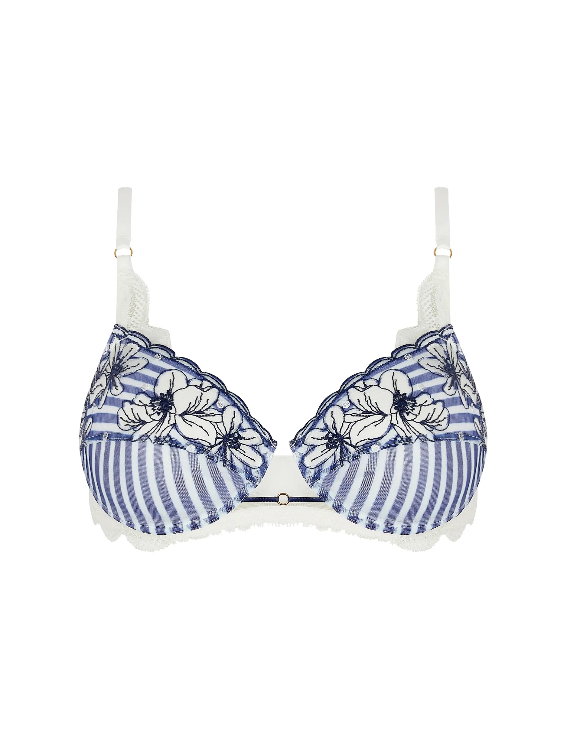 Exuding the essence of marine beauty, Cap Au Levant by Lise Charmel puts a fresh spin on a timeless wardrobe essential, blending the sophistication of sailor stripes with the ethereal touch of delicate floral embroidery and the allure of exquisite lace.