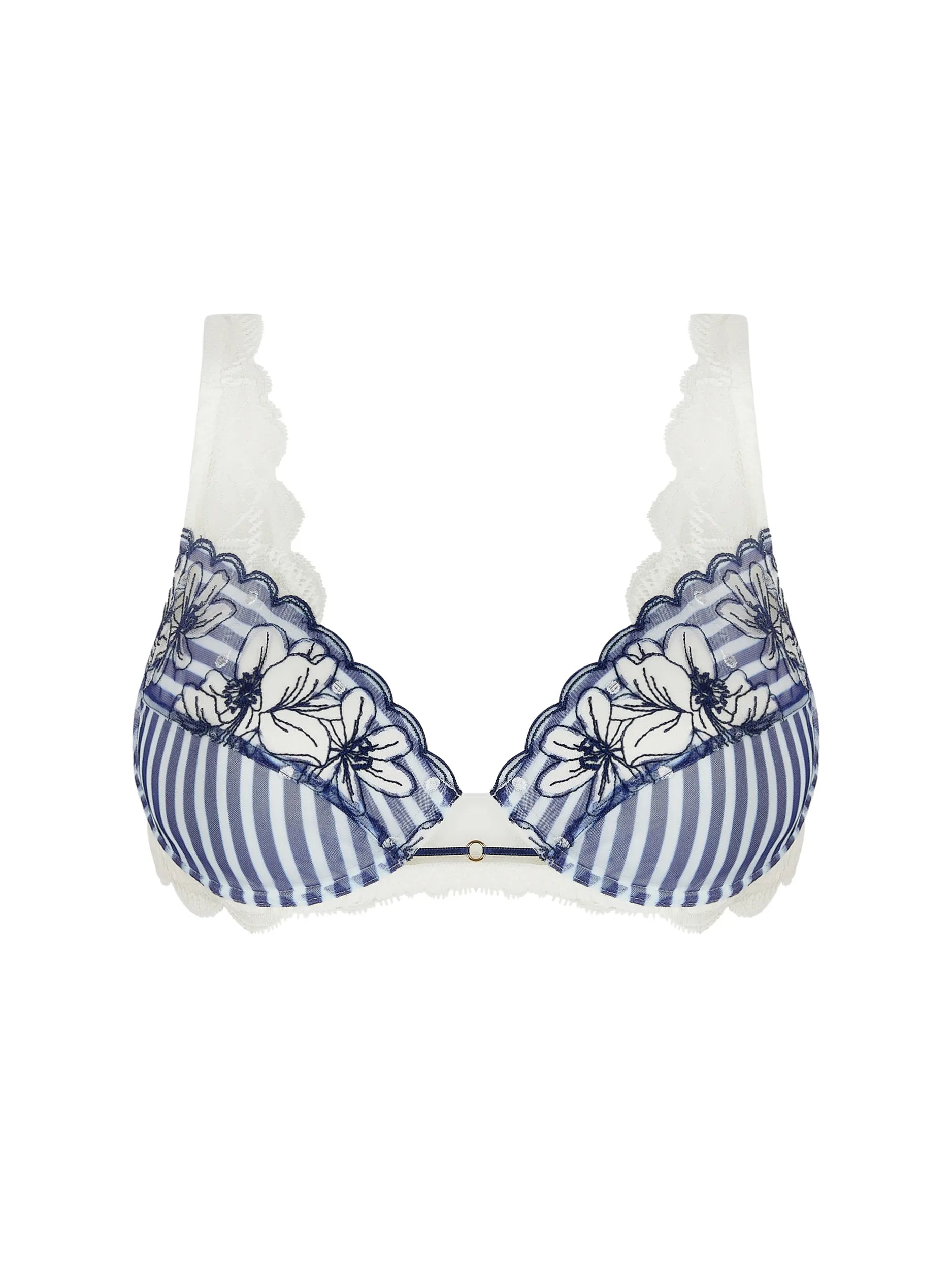 Exuding the essence of marine beauty, Cap Au Levant by Lise Charmel puts a fresh spin on a timeless wardrobe essential, blending the sophistication of sailor stripes with the ethereal touch of delicate floral embroidery and the allure of exquisite lace.