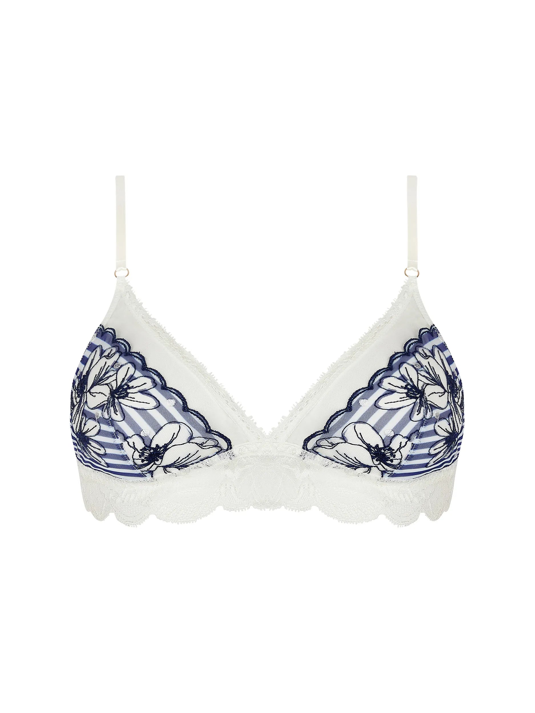 Exuding the essence of marine beauty, Cap Au Levant by Lise Charmel puts a fresh spin on a timeless wardrobe essential, blending the sophistication of sailor stripes with the ethereal touch of delicate floral embroidery and the allure of exquisite lace.