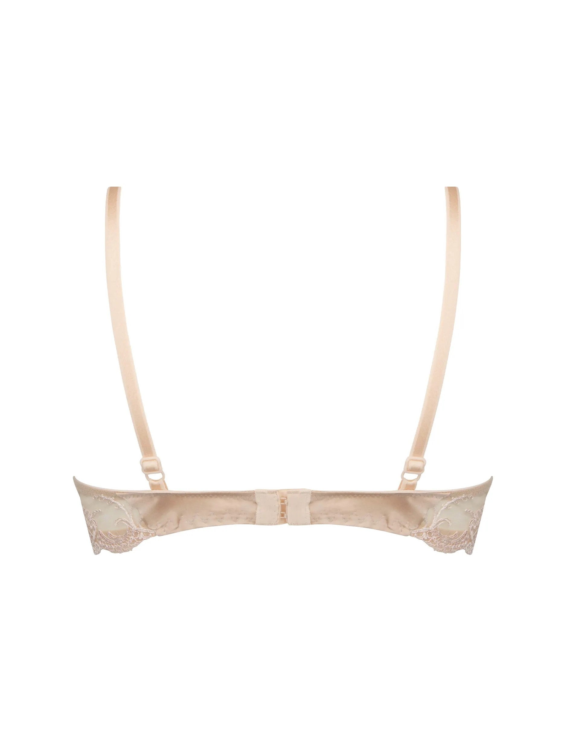 The Splendeur Soie line by Lise Charmel presents a luxurious triangle bra crafted with a satin-silk fabric and intricate Italian-made embroidery. A harmonious combination of foliage and palm fronds adorn the garment with a sumptuous look, while its sheen and elasticity provide a comfortable and radiant touch of luxury.
