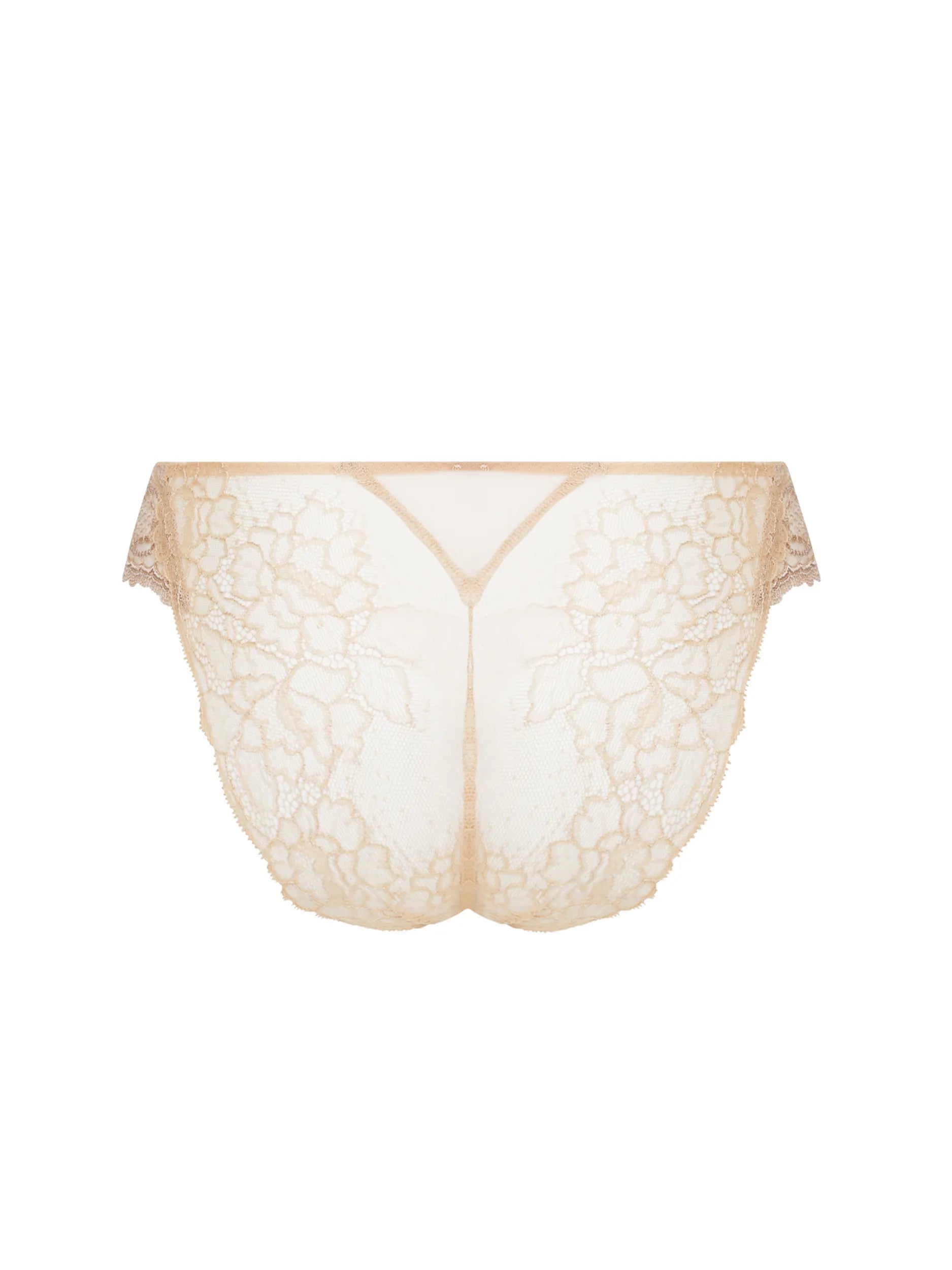 Experience luxurious indulgence with the Italian brief by Sublime En Dentelle. Featuring exquisite Calais Leavers lace on both the front and back, this brief also boasts intricate scalloped embroidery on the sides and a delicate tulle back triangle. With its front leg indentation and sheer back, this piece is a perfect blend of sophistication and sensuality. Feel the elegance and exclusivity of Sublime En Dentelle with this stunning bikini brief. Authenticated Leavers Loom Dentelle de Calais-Caudry® lace comes included with a certificate.