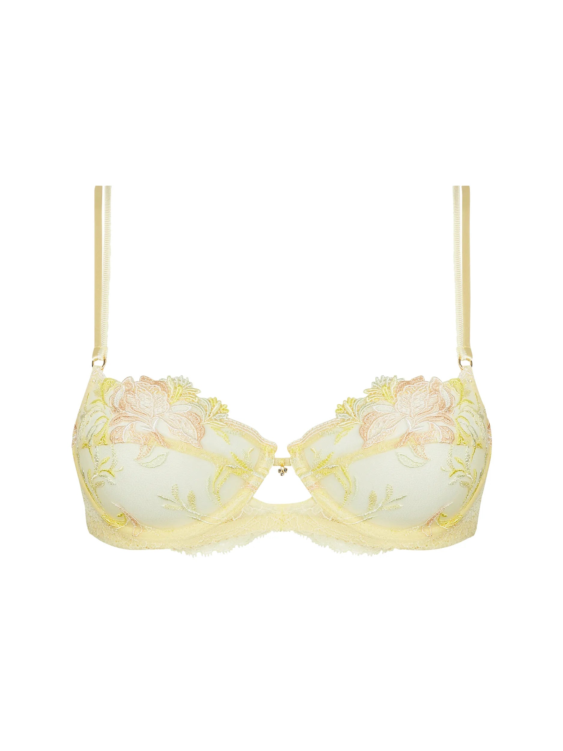 Embrace the elegant charm of Lise Charmel’s Frisson d'Or Demi Cup Bra, drawing inspiration from the serene allure of a blossoming summer garden. Its demi-cup design with a horizontal seam creates a gracefully rounded neckline that highlights feminine beauty. Delicate scalloped multi-thread embroidery adorns the cups, adding refined detail, while the Basque Leavers lace and intricately embroidered back yoke enhance this exquisite creation.